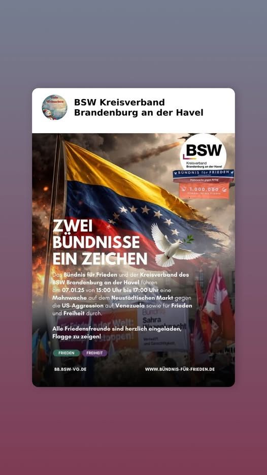 Das Bündnis für Frieden freut sich auf alle Brandenburgerinnen und Brandenburger, die friedlich gegen Kriege demonstrieren möchten. Das Mitbringen von Friedensfahnen und ähnlicher verbindender Symbolik ist ausdrücklich erwünscht."